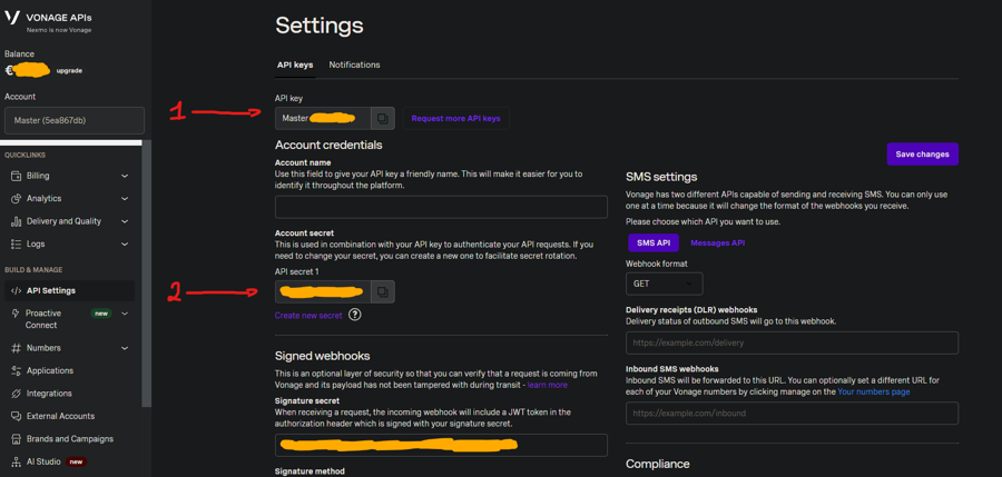 Set API keys Go ON : Vonage Site
